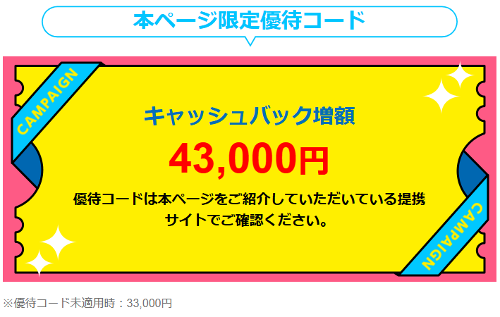 金額は当サイト限定の優待コード「PWDT」入力で43,000円、乗り換えではさらに解約金相当額(最大40,000円) も受け取ることができます。